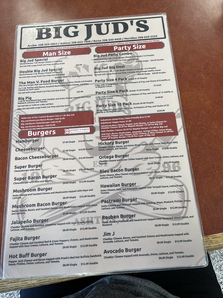 Add Cheddar Cheese, $. for Regular Burger and $. for a Big Jud. Add Ham, Bacon, Mushrooms, Jalapenos, Ortega Chile, Onion Rings, Avocado, Pepperjack, Swiss, or Bleu Cheese, $. for a Regular Burger and $. per Big Jud Layer. Add Hawaiian, Reuben, Hickory, or Bleu Bacon Fixin's to your Big Jud for $. per Layer.